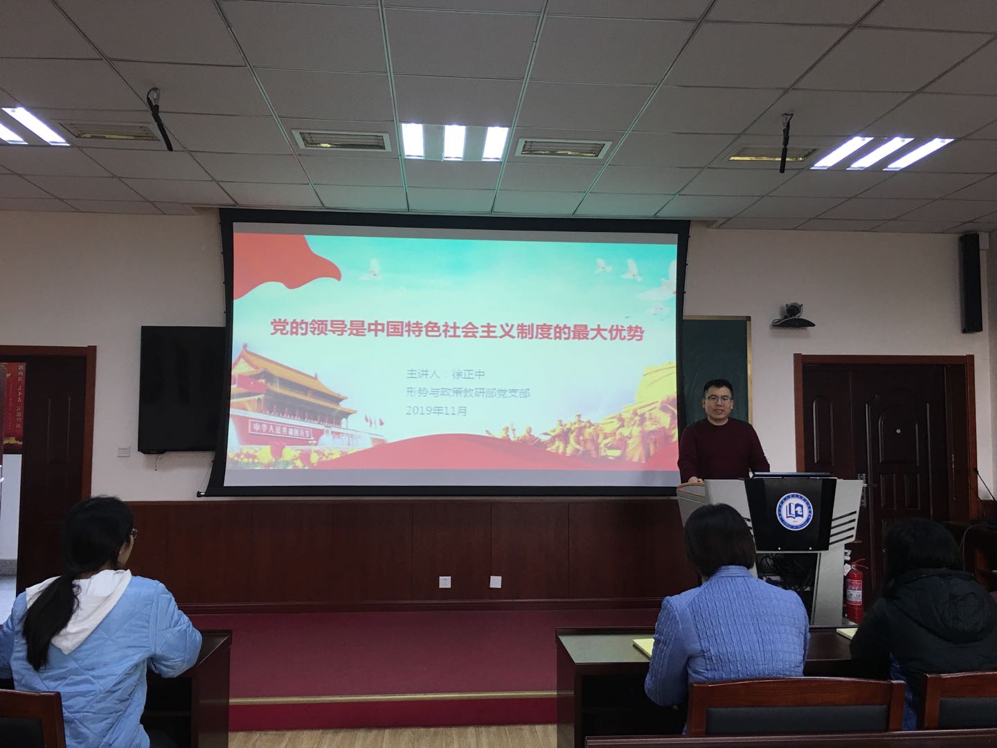 11月27日,形势与政策教研部党支部开展学习贯彻党的十九届四中全会精神专题会议,活动由党支部副书记徐正中主持。