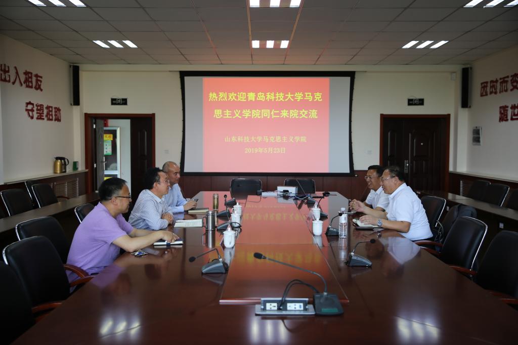 5月23日,青岛科技大学完美体育官方网站院长曹胜、山东省高校马克思主义理论专业委员会副主任委员牟宗荣来院交流,院长逄奉辉、院党委书记郭加书、副院长邵勇与客人进行了座谈。