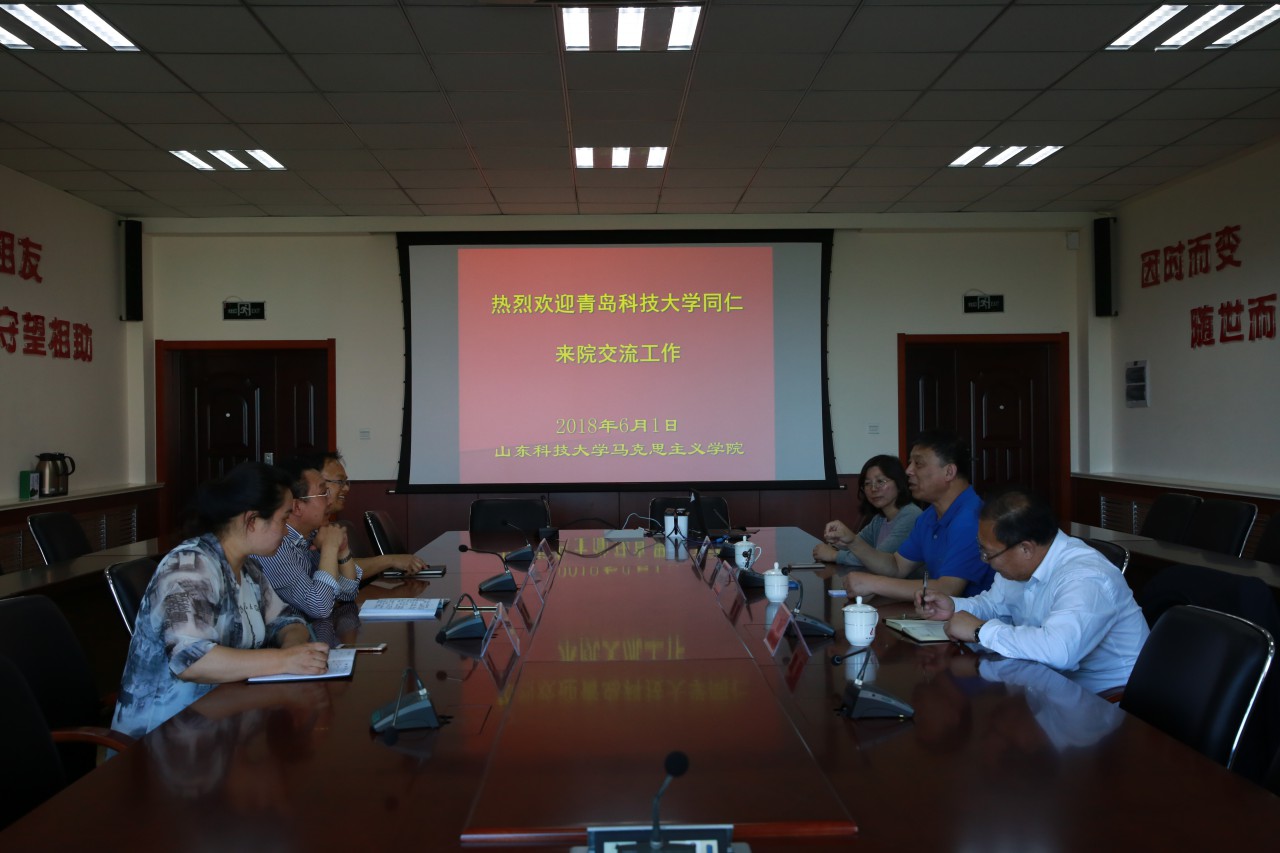 6月1日下午,青岛科技大学完美体育官方网站院长曹胜、副院长曲慧敏、马克思主义理论研究中心主任杜裕禄一行来院进行工作交流。院长逄奉辉、副院长邵勇、院长助理常春在J9-223会议室接待了客人。