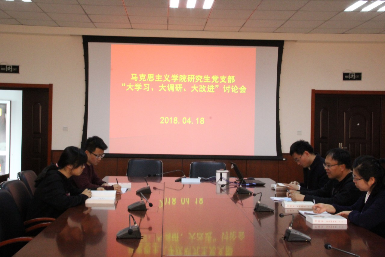 2018年4月17日,马克思主义基本原理教研部党支部召开“大学习、大调研、大改进”讨论会,院长逄奉辉参加指导会议,支部全体党员参加。 2018年4月17日,形势与政策教研部党支部召开“大学习、大调研、大改进”讨论会,支部全体党员参加。 2018年4月18日,中国近现代史教研部党支部召开“大学习、大调研、大改进”讨论会,副院长邵勇参加指导会议,支部全体党员参加。 2018年4月18日,中国马克思主义理论教研部党支部召开“大学习、大调研、大改进”讨论会,副院长邵勇参加指导会议,支部全体党员参加。 2018年4月18日,完美体育官方网站研究生党支部召开“大学习、大调研、大改进”讨论会,副院长邵勇参加指导会议,支部全体党员参加。