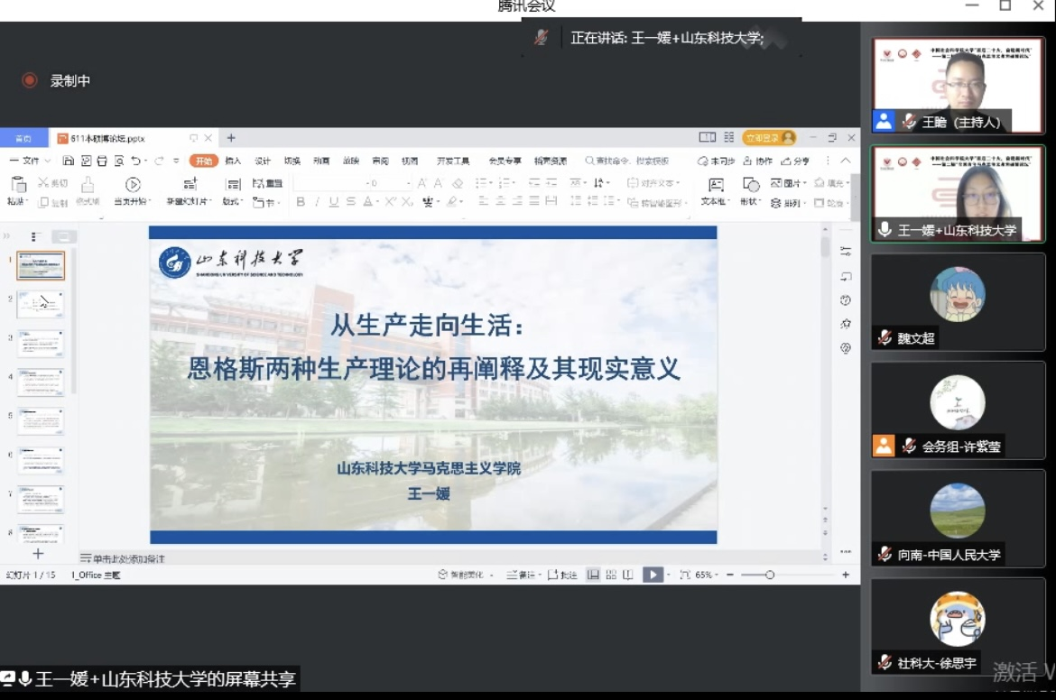 在分论坛发言阶段,学院2021级研究生王一媛以“从生产走向生活:恩格斯两种生产理论的再阐释及其现实意义”为题,从四个方面展开报告,以两种生产理论为基础,对“美好生活”这一现实命题的实现路径进行了系统阐释。