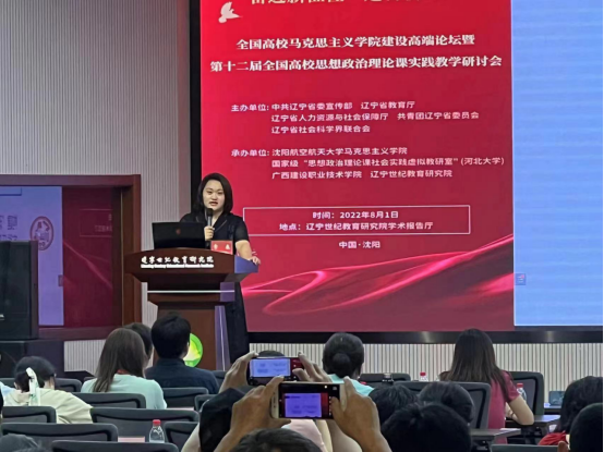 8月1日,由中共辽宁省委宣传部、辽宁省教育厅、辽宁省人力资源和社会保障厅、共青团辽宁省委员会、辽宁省社会科学界联合会主办的“全国高校完美体育官方网站建设高端论坛暨第十二届全国高校思想政治理论课实践教学研讨会”在沈阳成功举办。我院副院长常春教授参会并以“‘融蓝于红 精准主题'思政课实践教学模式探究”为题做大会主题发言,向参会的四十多所高校完美体育官方网站同行宣介我院实践教学的模式与成果,获得大会一致好评。