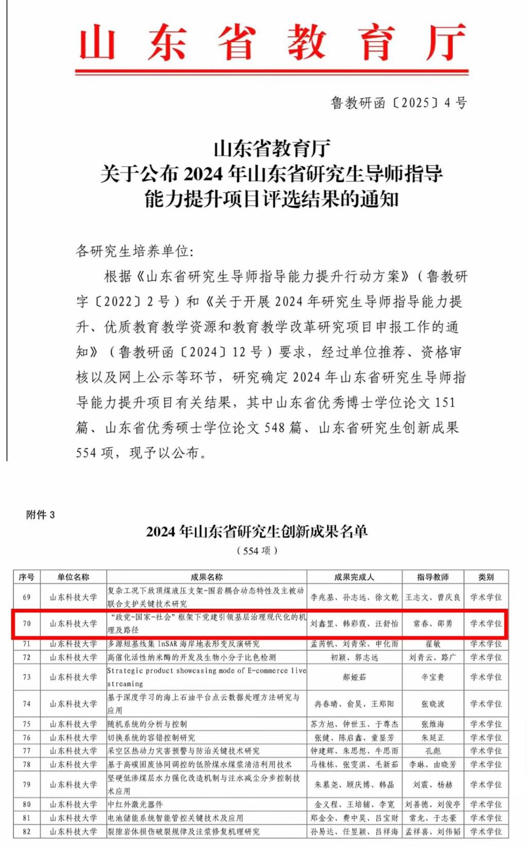 近日,山东省教育厅公布了2024年度山东省研究生创新成果获奖名单,学院研究生刘鑫罡、韩彩霞、汪舒怡(指导教师:常春教授、邵勇教授)申报的《“政党-国家-社会”框架下党建引领基层治理现代化的机理与路径研究》成功入选。