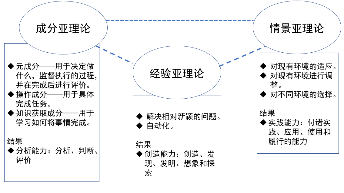 根据美国耶鲁大学心理学教授罗伯特·斯滕伯格(R.J.Sternberg,1985)提出的“智力三元论”,智力不仅仅是智商。人类的智力乃是由连接的三边关系组合的智力统合体。智力统合体的三边智力成分亚理论、智力情境亚理论和智力经验亚理论,可视为构成智力的三种成份;各边之长度因人而异,也由此而形成智力的个别差异。斯滕伯格的理论得到了对大脑前额叶受损病人的研究结果的支持,这种人的行为缺少了智力中的一些重要成分,而这些成分却没有被大多数智力测验测量出来。